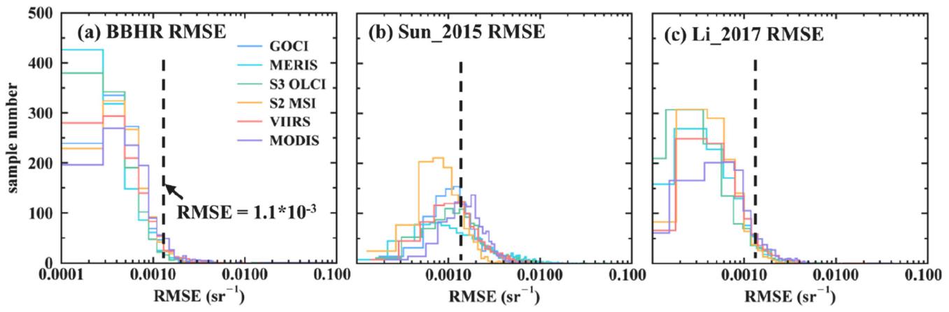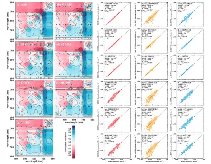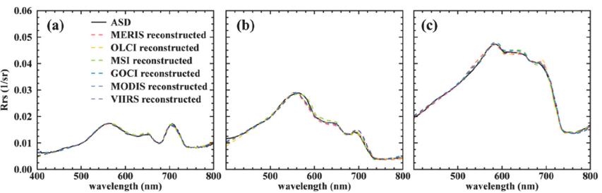 水质参数遥感反演技术经过长期发展,已经形成大量高光谱模型。但受制于当前传感器配置,这些模型很难应用到具有高时空覆盖度的多光谱影像上,只能在少量高光谱影像上开展理论研究。对内陆水体水环境敏感参数(如叶绿素a浓度)的大范围精确监测还很难实现。光谱重构技术近期受到领域内广泛关注。该研究从水体辐射传输模型出发,模拟得到各种状态下的水体光谱共计10000条。进而结合稀疏表达方法,构建具有理论普适性的多光谱-高光谱联合冗余字典,通过稀疏表达方法实现内陆水体多光谱数据的高光谱重构。研究测试了GOCI、MERIS、S3 OLCI、S2 MSI、VIIRS、MODIS以及Landsat系列卫星多光谱传感器的重构效果,大部分传感器都能得到令人满意的重构效果,通过地面实测数据证实,重构结果可以切实提高水体叶绿素a浓度估算精度。该算法(BBHR)主要优势为:首先,与当前主流算法相比,该算法不依赖任何地面实测数据,因此在理论上具备普适性。并且,水体光谱特征可以在字典线性空间中被精确表达,重构精度明显优于现有的高精度算法。同时,算法对多源影像有很好的适应性,只需要对字典对进行简单调整,就可以实现多源影像高一致性协同监测。