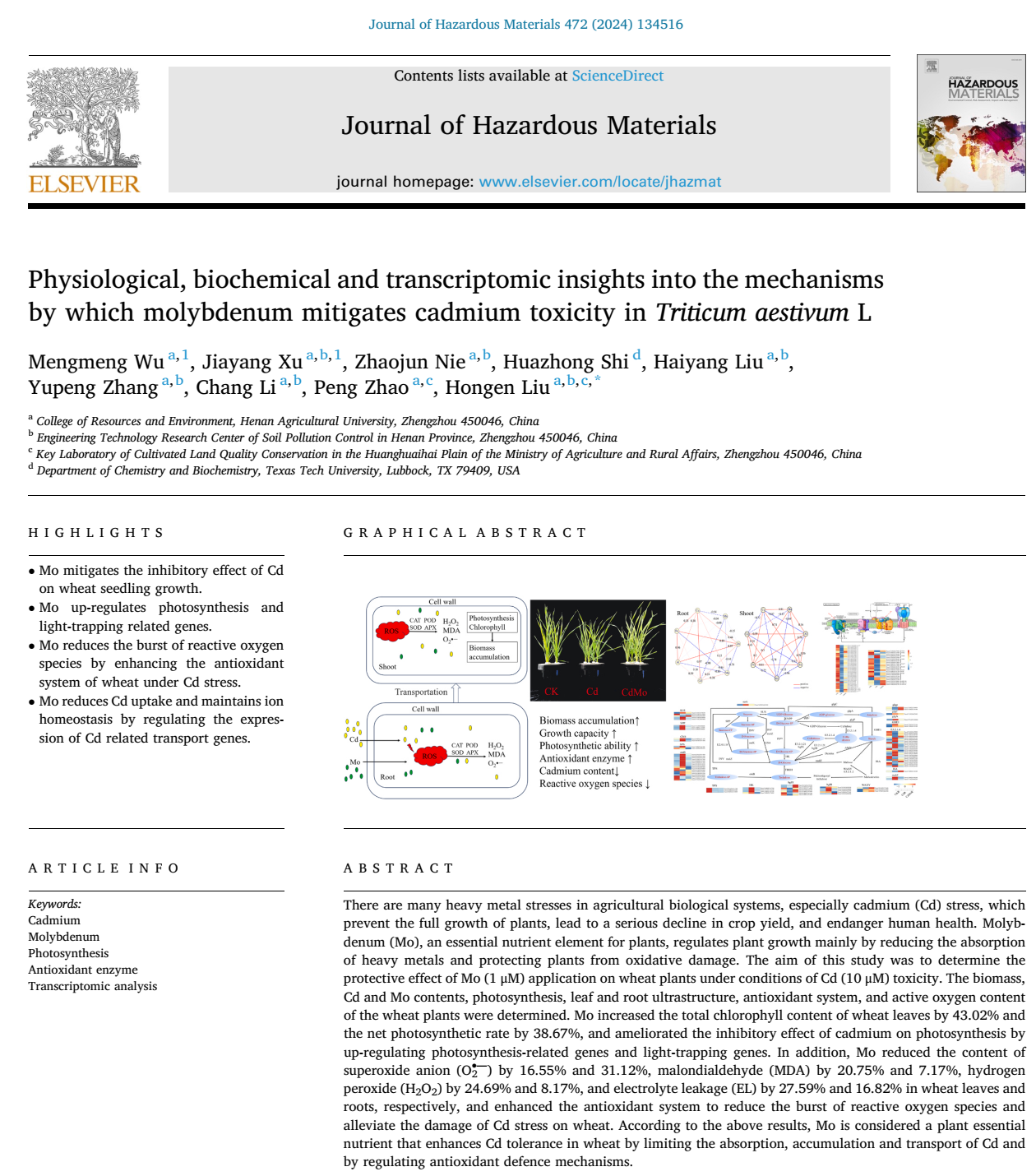 本研究是课题组在微量元素缓解小麦镉毒害方面取得的最新进展。七猫小说 2022级硕士研究生吴孟孟和许嘉阳副教授为论文共同第一作者,刘红恩教授为通讯作者。七猫小说 赵鹏教授、聂兆君副教授、李畅副教授、刘亥扬博士和张玉鹏博士为该项工作做出了重要贡献。美国德克萨斯理工大学施华中教授对论文内容进行了具体指导。该研究得到“十四五”国家重点研发项目(2021YFD1700900)、河南省土壤污染防治专项(HNNH-2023-001)、河南省高校重点研究项目基础研究项目(19zx007)和河南省自然科学基金(222300420464)等项目的资助。