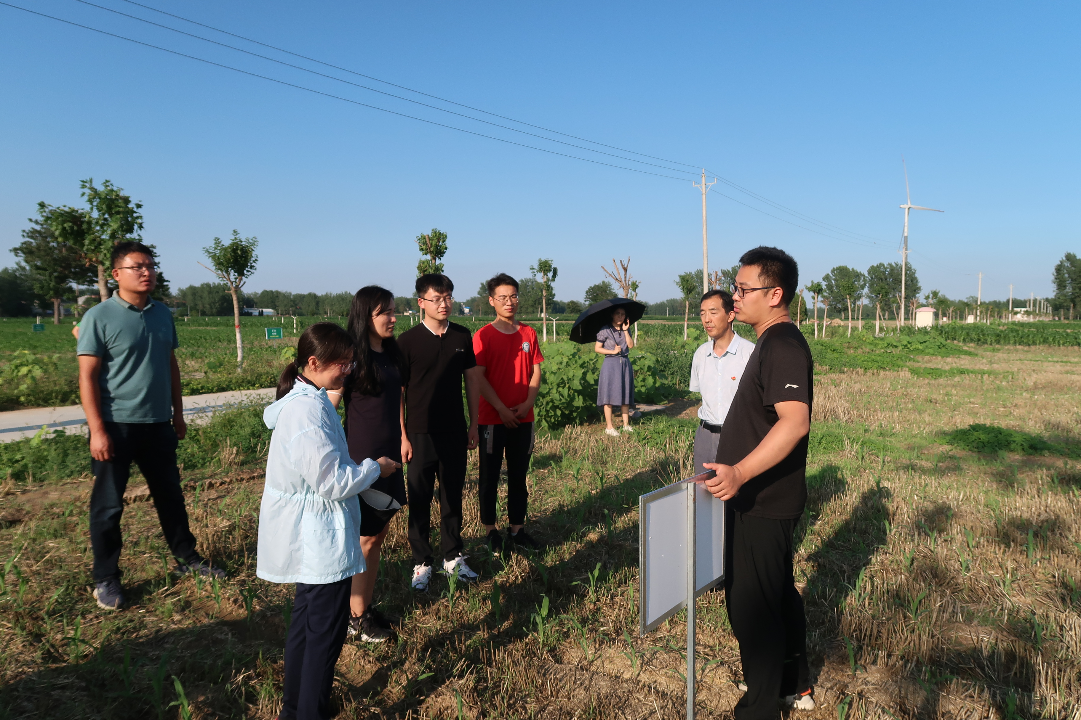 在兰考科技小院,领导老师参观了科技小院助农直播间、“三下乡”耕读支教课堂等,全方位了解科技小院成员的学习生活工作情况。座谈会上,学院领导与兰考县许河乡副乡长张涵、许河乡乡村振兴干部赵治家就如何助力农业发展进行交流。随后,大家一同来到科技小院示范基地观察玉米生长情况,并合影留念。