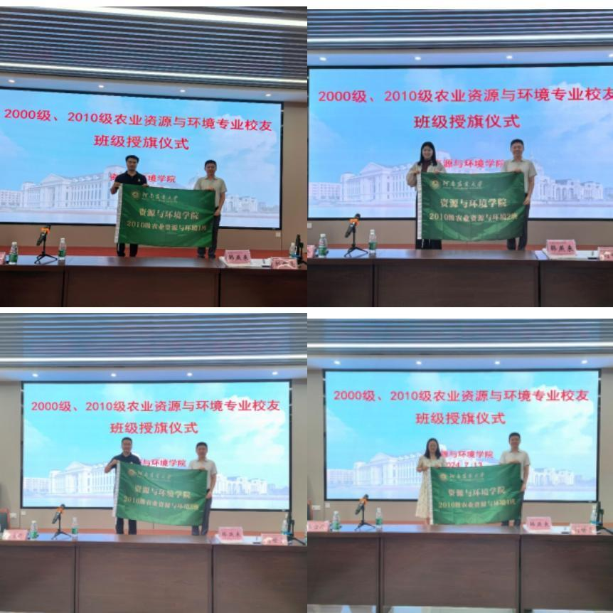 王宜伦代表学院致辞,他向各位校友介绍了学院的基本情况和近年来取得的成绩,并向同学们送上了美好祝福,希望校友们永远以母校为家,常回来看看,学院将搭建校友交流合作平台,共同为母校中国特色世界一流农业大学创建贡献力量。闫东代表学校向2000级农业资源与环境1-3班和2010级农业资源与环境1-4班授班级旗帜和校友徽章,希望校友不忘班级的荣誉、责任和使命,保持不断前进的动力,继续发扬专业的优良传统,在各自的工作岗位上,为社会贡献更多的力量。