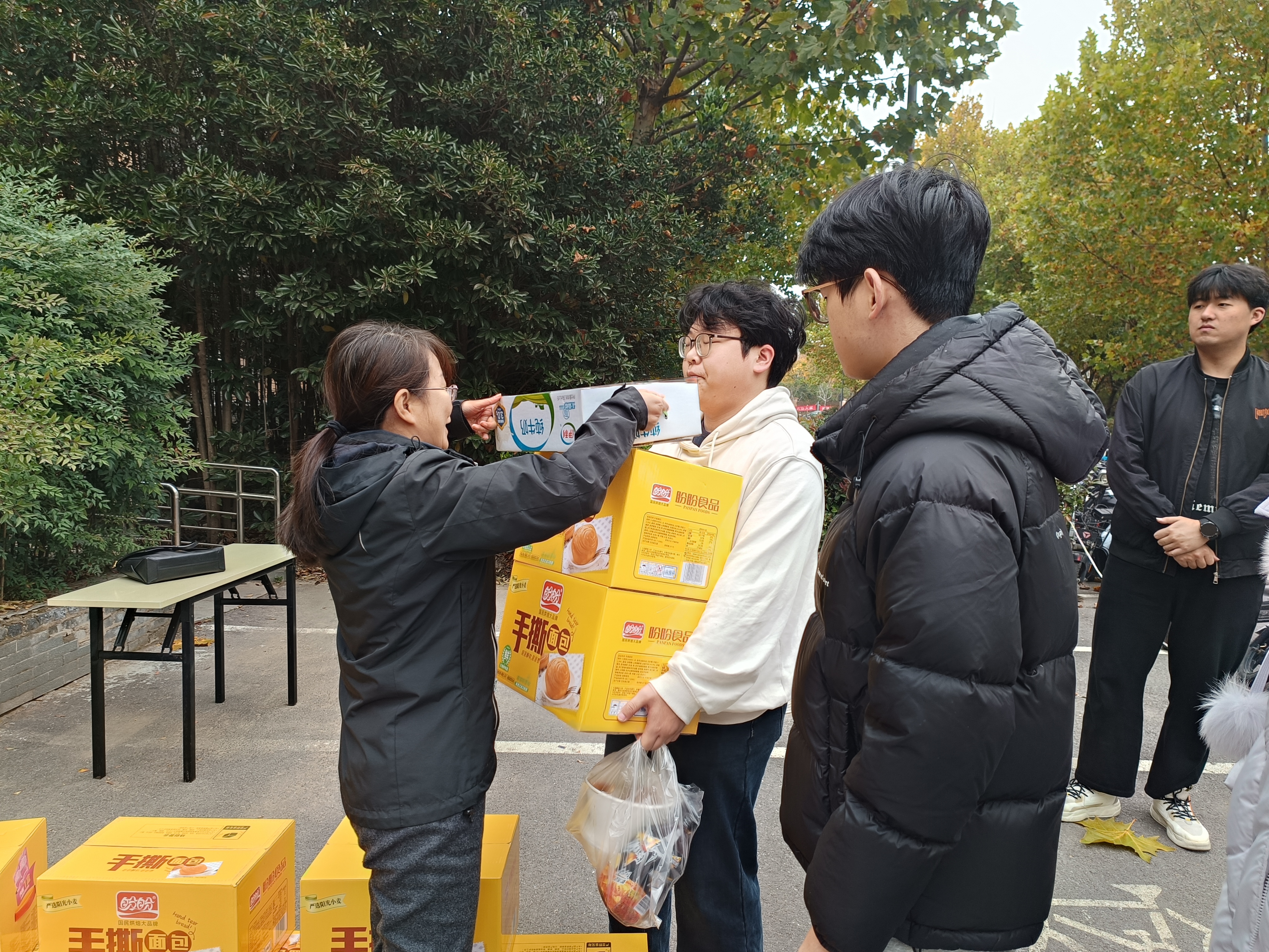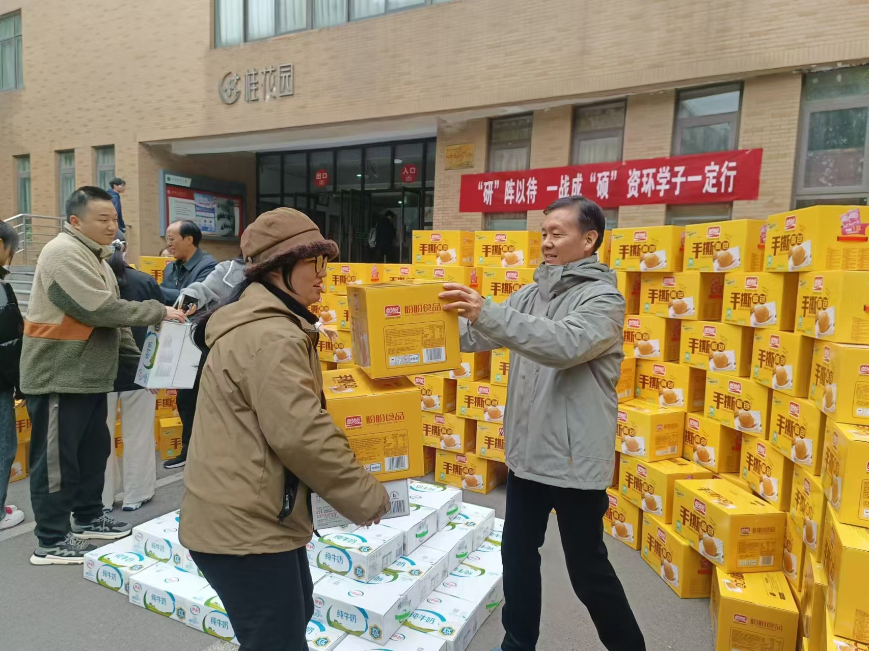 期间,学院领导老师亲切询问同学们的备考复习与生活情况,并叮嘱大家积极调整状态,保持良好心态,保证规律作息,坚持稳打稳扎、全力以赴,迎战考研。一箱箱饱满关心关爱的面包、牛奶送到考研学子手中,承载着学院老师对考研学生的殷切期望和诚挚祝福,希望他们既有学到最后一刻的决心,也有迎接一次人生大考的坦然,一战成硕,金榜题名!
