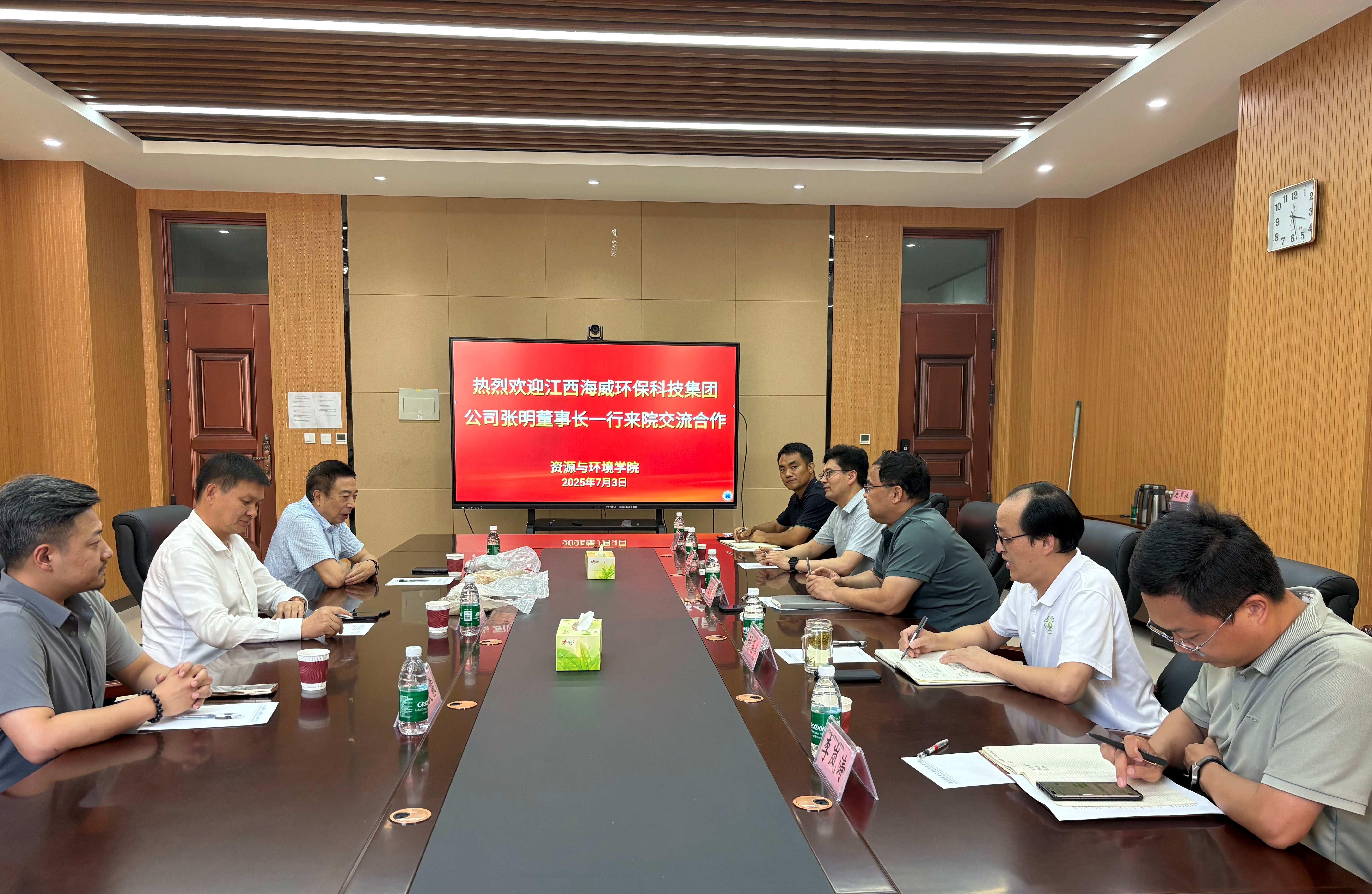 7月3日下午,江西海威环保科技集团公司董事长张明一行3人来七猫小说 交流。院长王宜伦、副院长刘世亮和教师代表出席座谈会。