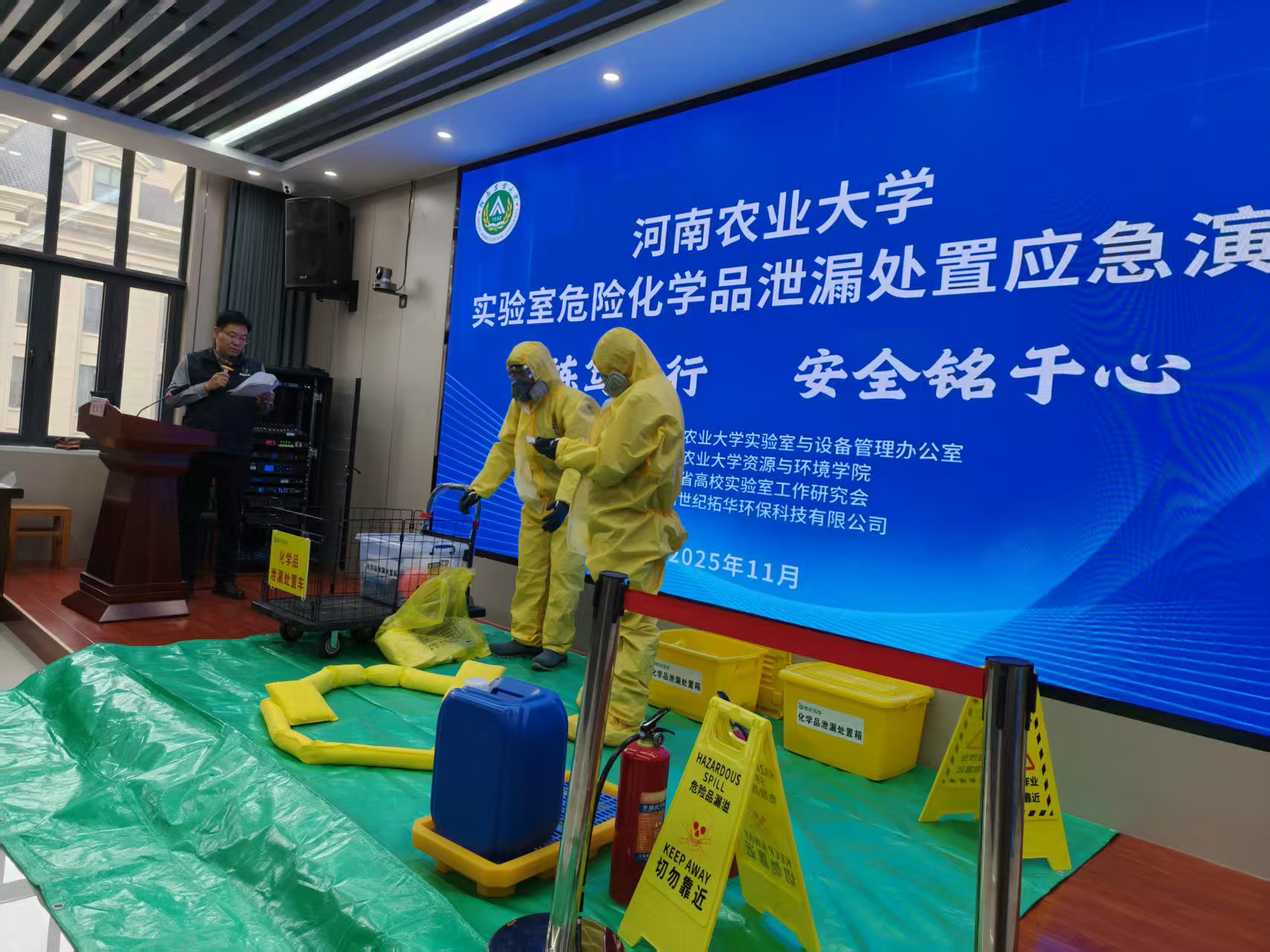 作为本次演练的协助单位,七猫小说 始终将实验室安全置于重要位置,尤其重视危化品泄漏应急处置工作。演练伊始,院党委书记李兴道致辞,他表示,危化品是教学科研的重要支撑,但泄漏风险直接威胁师生安全与周边环境,学院秉持 “防患于未然”原则,希望通过模拟真实场景,帮助师生熟悉处置流程、掌握应急技能,为应对突发事故做好准备。演练以“情景构建+实战处置”模式展开,以“学生倾倒废液时发生溢撒泄漏”为背景,完整演示应急全流程:从事故第一时间上报、现场人员有序撤离、危险区域封锁,到专业团队开展危害评估、救援人员规范穿戴防护装备、科学消除危险源,再到最终完成现场恢复,各环节衔接紧密、操作规范。河南世纪拓华环保科技有限公司技术团队全程现场指导,让师生沉浸式掌握实战处置要点。最后,实验室与设备管理办公室主任田志强做总结讲话,他指出本次演练贴合实际、组织有序,希望各单位以此次演练为契机,进一步强化安全意识,将应急技能融入日常实验室管理。