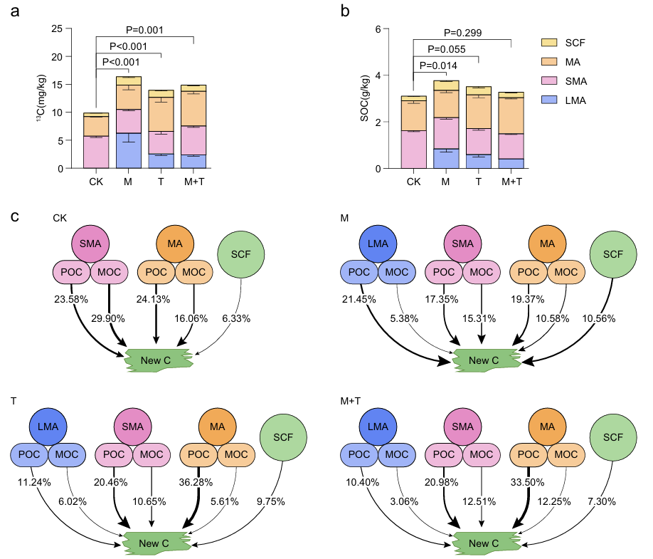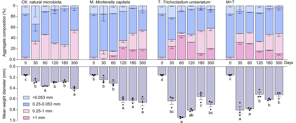 本研究通过13C同位素标记结合密度-粒径联合分析的方法,系统调查了300天培养周期内低等真菌Mortierella capitata与高等Trichocladium uniseriatum在秸秆降解过程中对土壤团聚体形成、秸秆碳分配及有机碳积累的影响,重点分析了不同类型真菌驱动碳在颗粒有机碳与矿物结合有机碳之间分配路径的差异及动态演变规律。研究发现,真菌接种显著促进了大团聚体(>1 mm)的形成及秸秆来源碳在大团聚体中的积累,最终使土壤有机碳含量较土著微生物处理分别提高了21.71%和13.14%。在整个培养期内,秸秆来源碳进入土壤有机碳的过程集中在两个时间节点,与植物残体分解的两阶段理论相吻合。不同进化程度的真菌驱动土壤团聚体形成的机制存在根本性差异:低等真菌主要通过矿物结合有机碳途径逐级促进团聚体形成,而高等真菌则优先通过颗粒有机碳途径促进大团聚体形成,随后再破碎为微团聚体。研究结果深化了对真菌介导土壤团聚体形成机制的认知,为构建高效提升土壤团聚化水平的真菌菌群组合提供了物种配伍依据与核心理论指导。