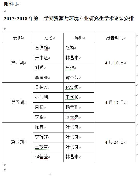 延续2017-2018年第一学期资源与环境专业研究生学术论坛安排,在本学期将安排剩余3期研究生学术报告会,名单附后(附件1)。