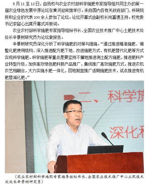 全国农业技术推广中心土肥技术处处长辛景树研究员为第一届农业绿色发展中原论坛做报告