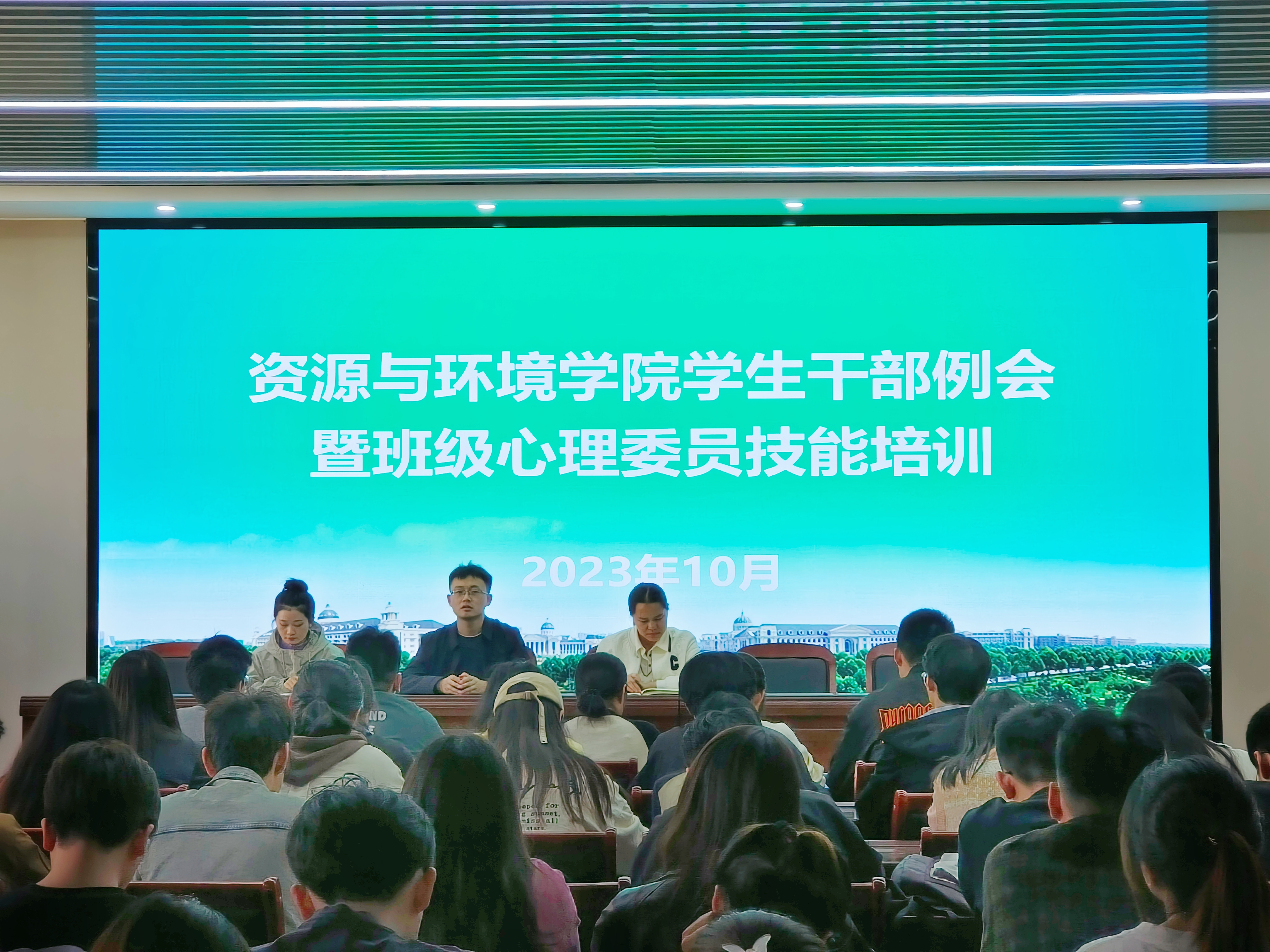 于力行楼338会议室召开学生干部例会暨心理委员培训会,院党委组织员胡明阳,团委副书记黄春萌,团委老师王梦茹,20、21、22级班长支书、班级心理委员、院学生会主席团及团委委员参加会议。