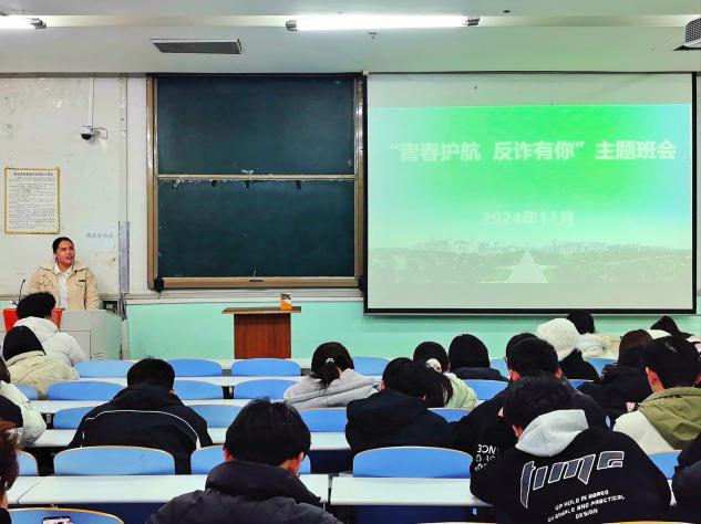 期间,学院团委副书记黄春萌为2024级全体学生主讲“反诈一节课”,通过讲解大学生群体中常见被骗案例,提醒同学们不要轻信陌生来电和短信,不向陌生人透露自己的身份证号、验证码等重要信息,不浏览非法网站或点击不明链接,不贪小便宜,不心存侥幸,不让不法分子有机可乘。
