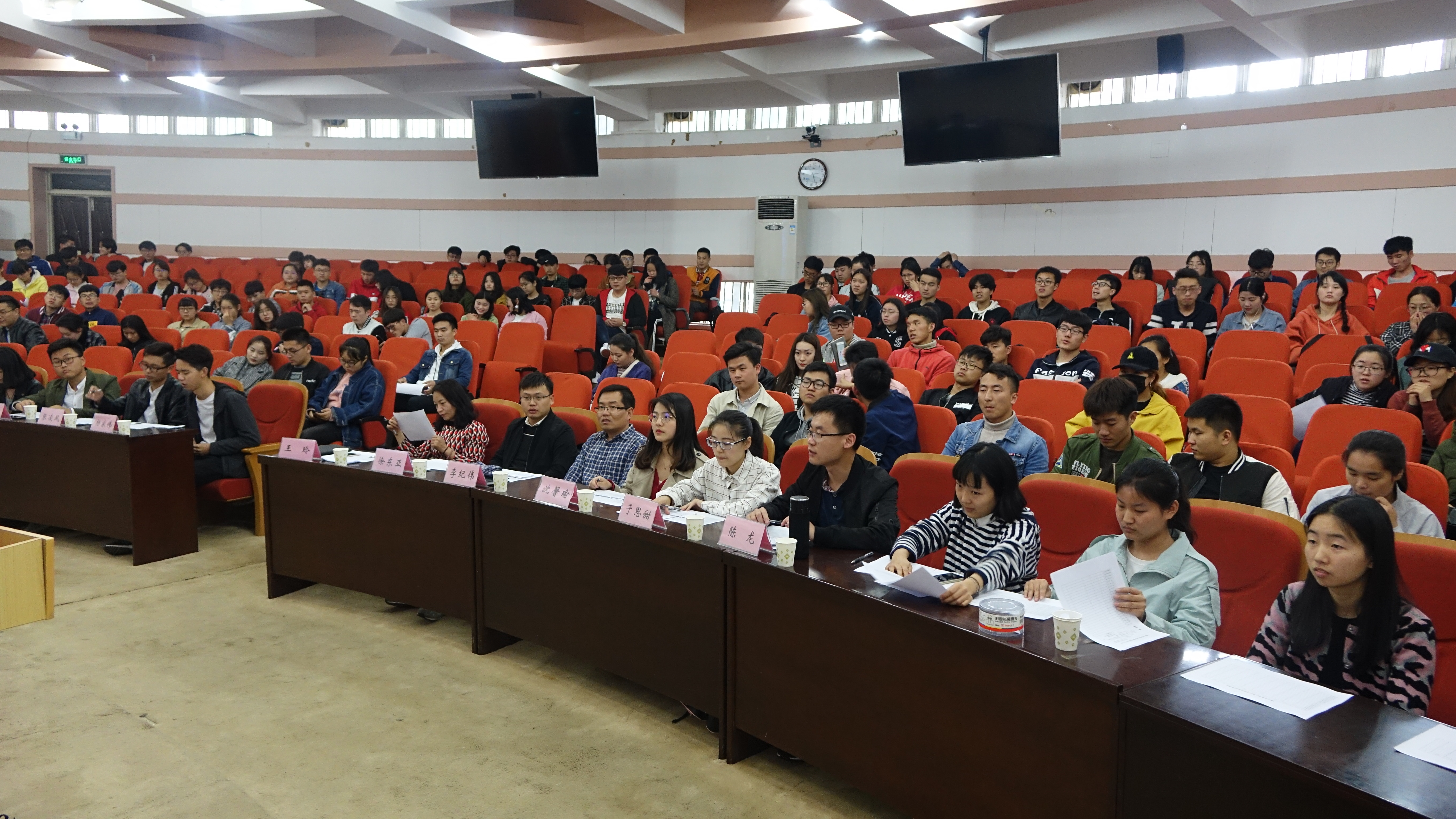 在300人报告厅举行先进班集体和红旗团支部评选大会。本次活动由院团委举办,团委书记王玲、辅导员李纪伟、徐东亚以及14级优秀学生代表陈龙等担任评委,15、16级班委代表到场参会。
