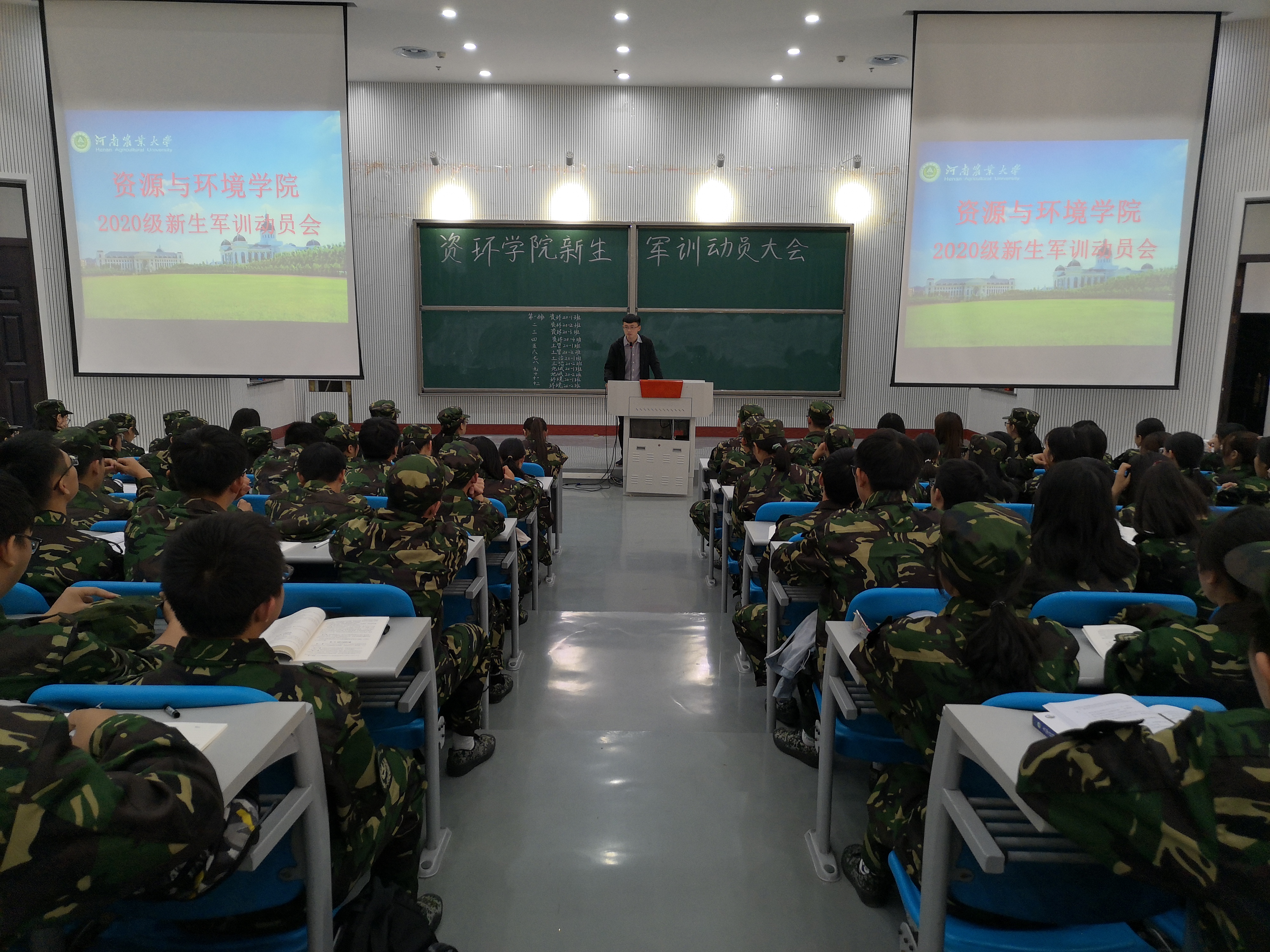 于10月8日中午在龙子湖校区大教室2举行新生军训动员大会。新生辅导员胡明阳老师、许嘉阳老师以及全体新生参加了此次动员大会。