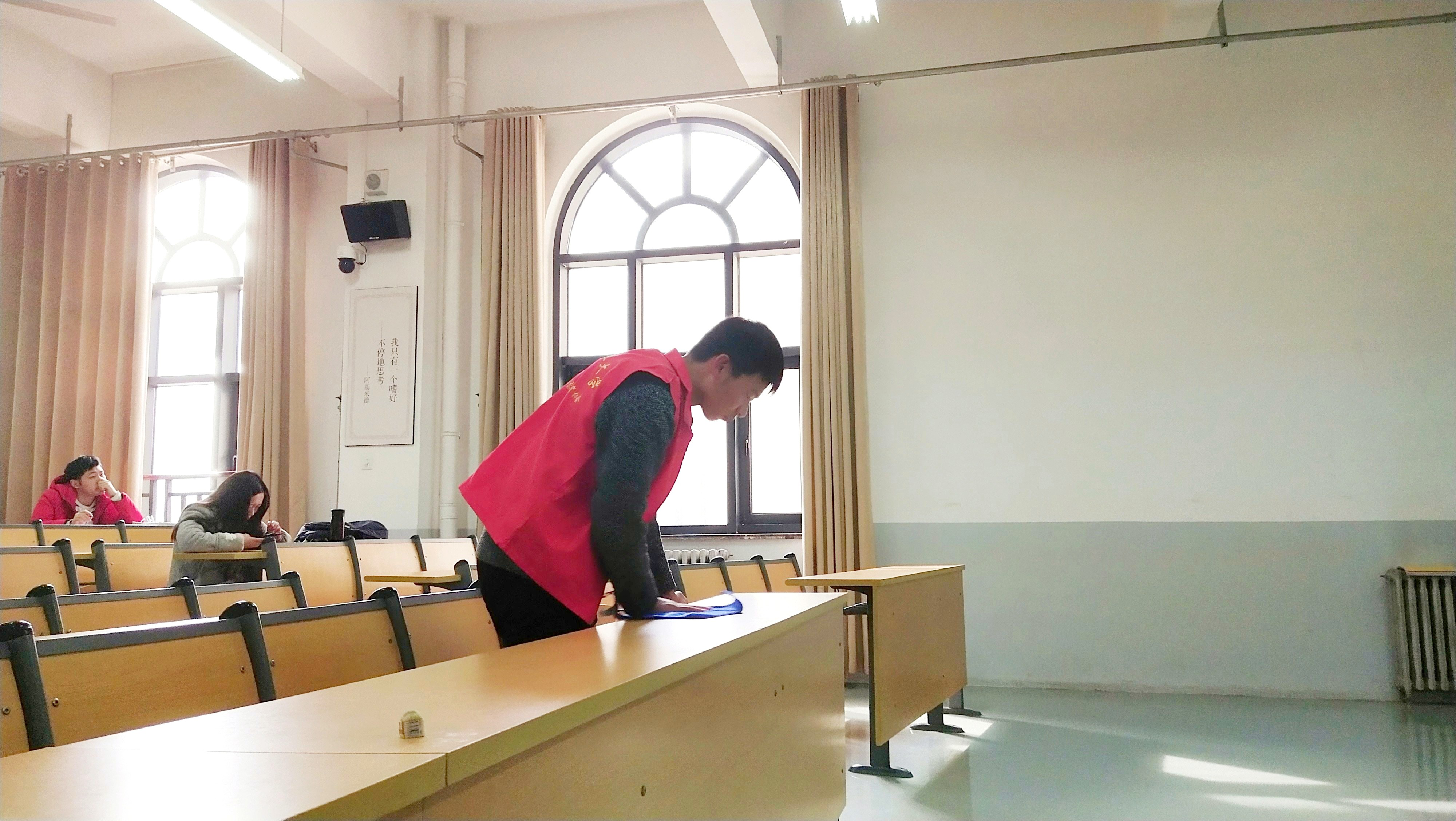 组织青年志愿者分别打扫了校园一餐厅一、二楼和教学楼C栋四楼。志愿者们分组配合,共同出力,对校园餐厅的地面、桌面和教学楼教室内外卫生均进行了清扫,为美化校园贡献了力量。志愿者们同时帮助上课老师将讲台桌面清理干净,为学校师生营造了干净整洁的讲课和学习环境。